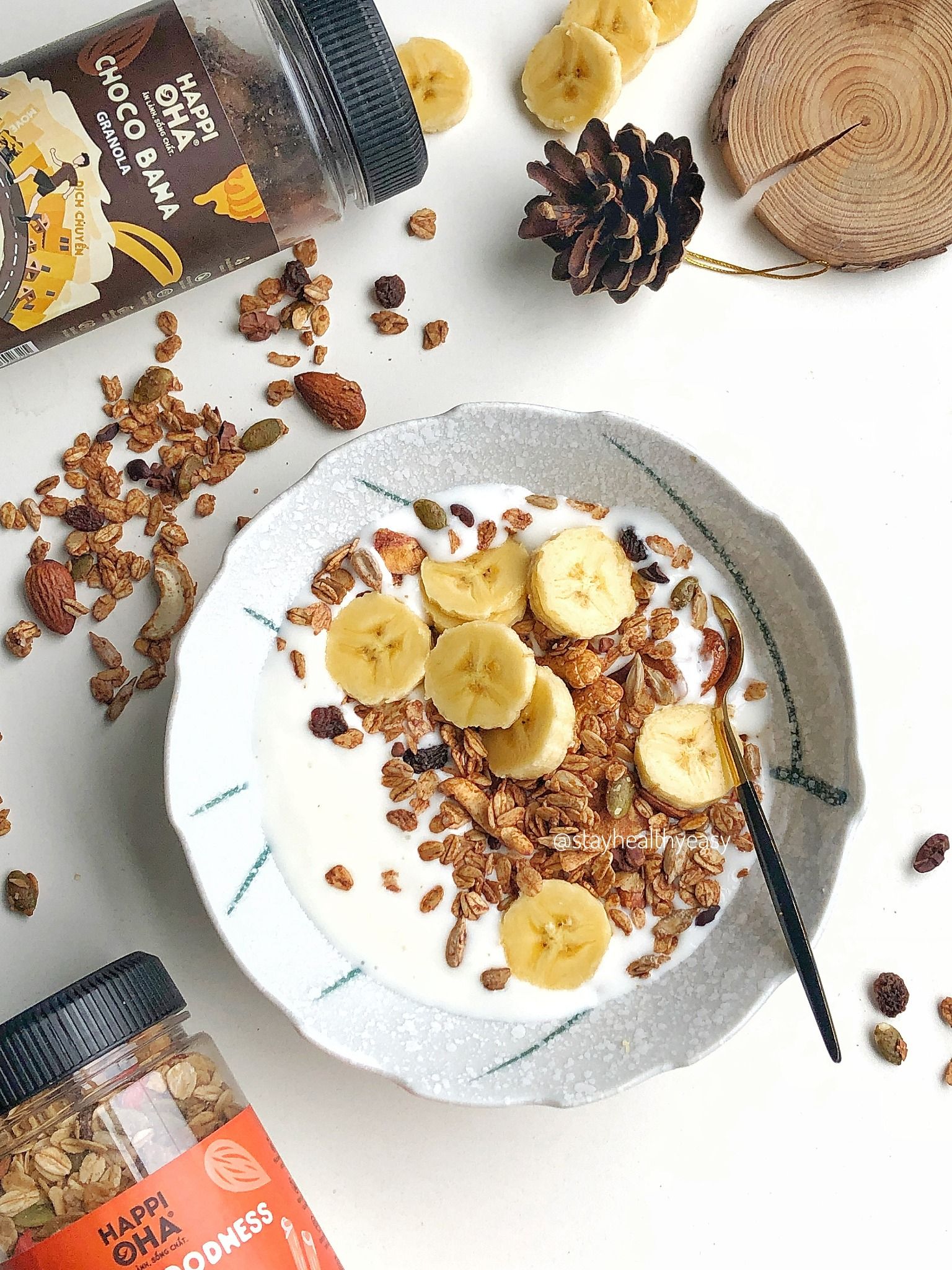 Choco Bana được bình chọn là dòng granola có mùi vị đặc sắc nhất vì yến mạch và hạt được nướng phủ bột cacao nguyên chất cao cấp (Bột chứa trên 25% bơ cacao, ủ lên men 6 ngày, phơi nắng tự nhiên 7 ngày, nghiền mịn 96 giờ).
