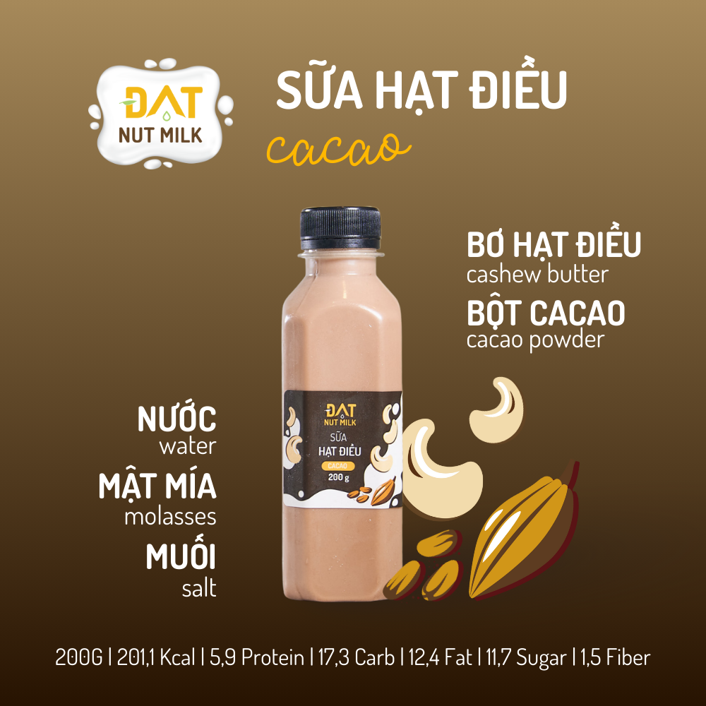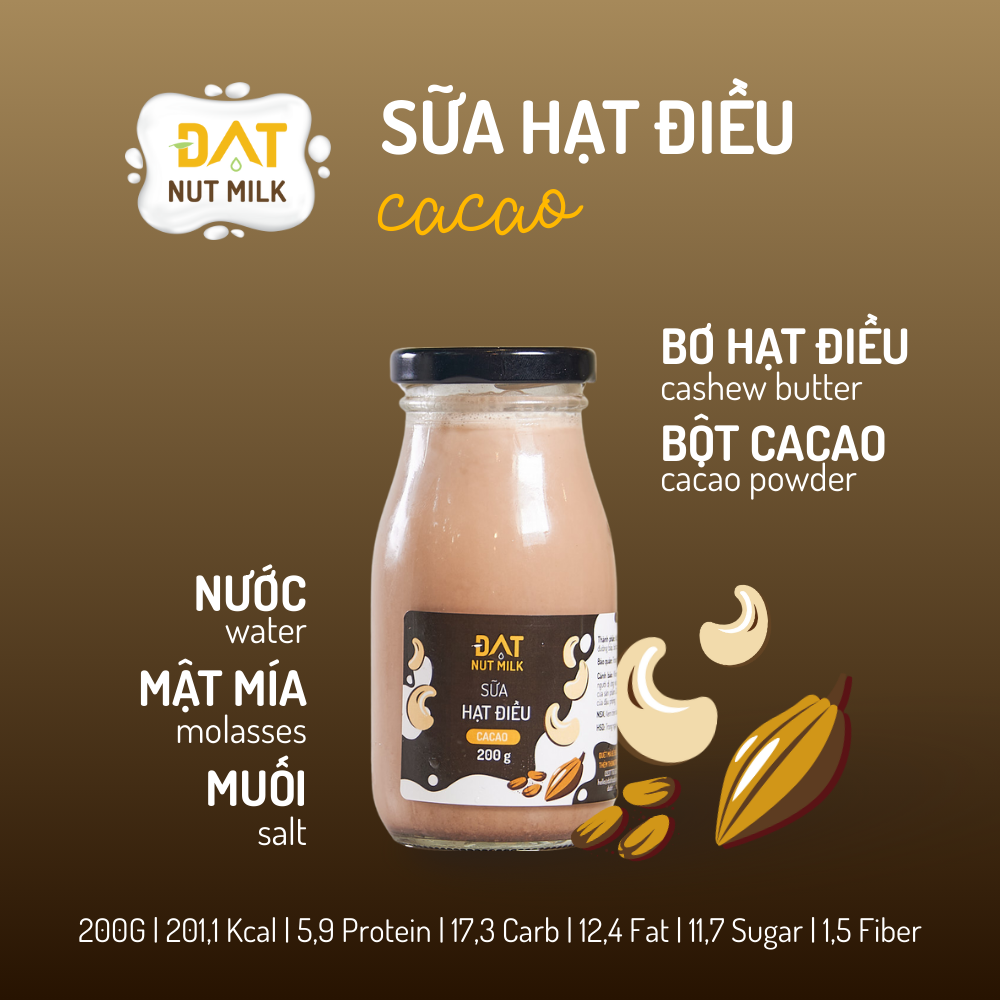 Thành phần: Nước, hạt điều, mật mía, BỘT CACAO, muối.